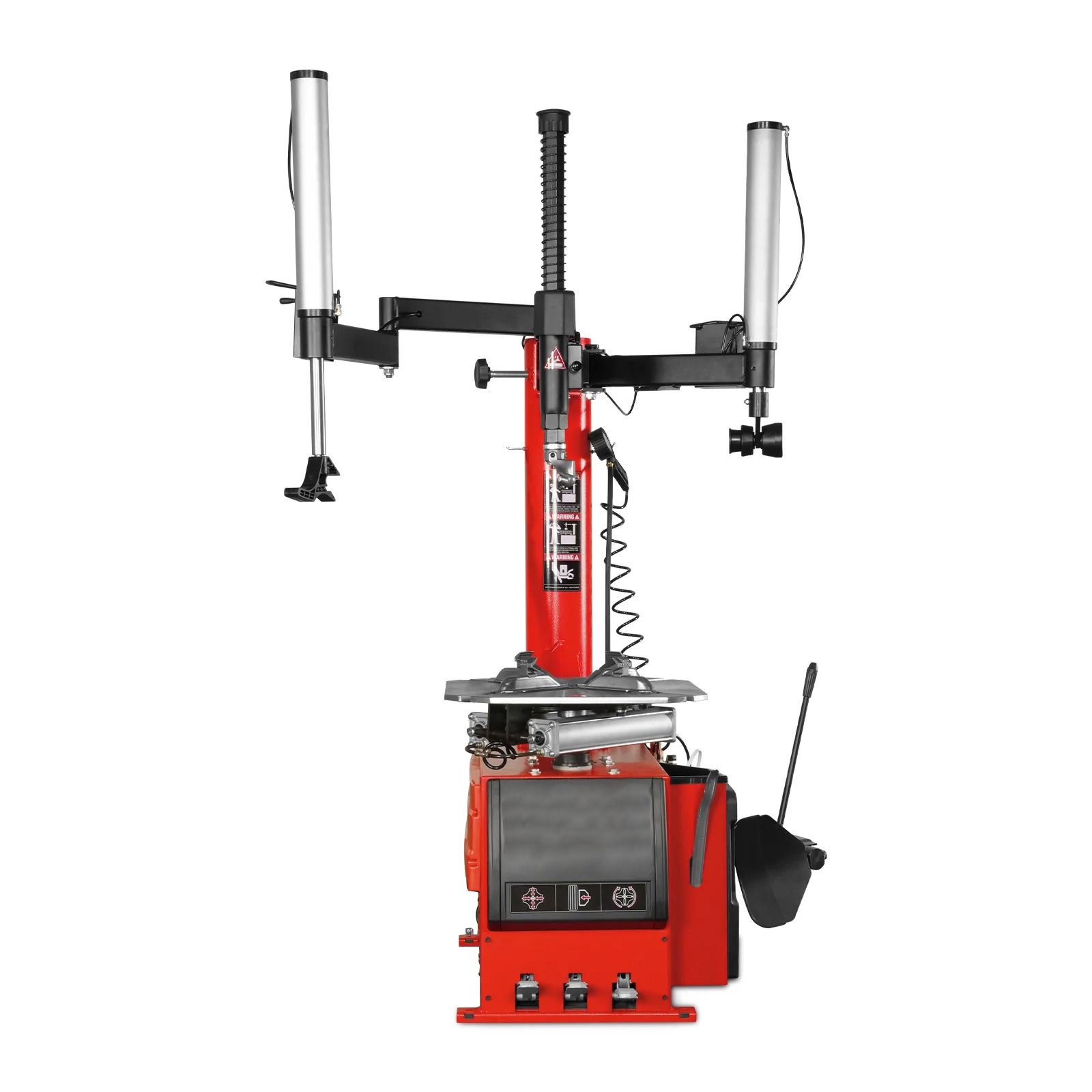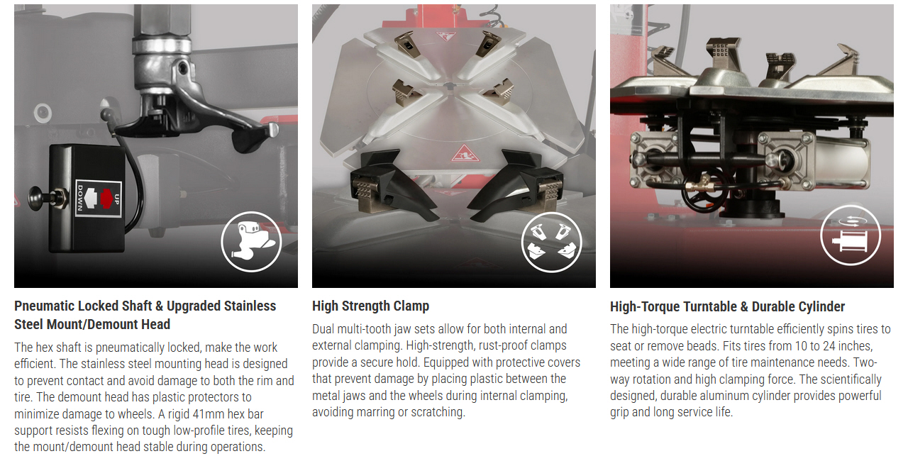 - Double Assist Arm for Tough Tires: The classic double assist arm design provides additional power when mounting difficult tires by preventing the bead from rolling back over the mount tool. Each assist arm can work independently, and tyre pressure can be adjusted individually, which is accurate and fast, saving time and effort. It comes with a drop-center cone, which holds the bead in the drop-center, further helping protect the tire during external clamping procedures.