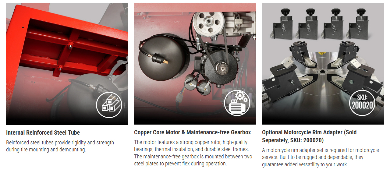 - Optional Motorcycle Adapter: When equipped with a motorcycle adapter (sold separately), this tyre changer can also handle motorcycle tires.